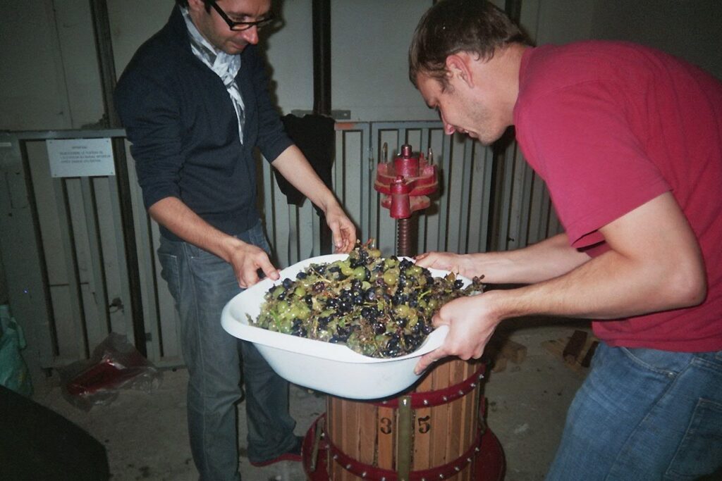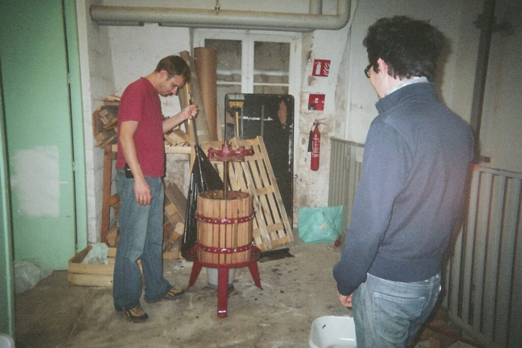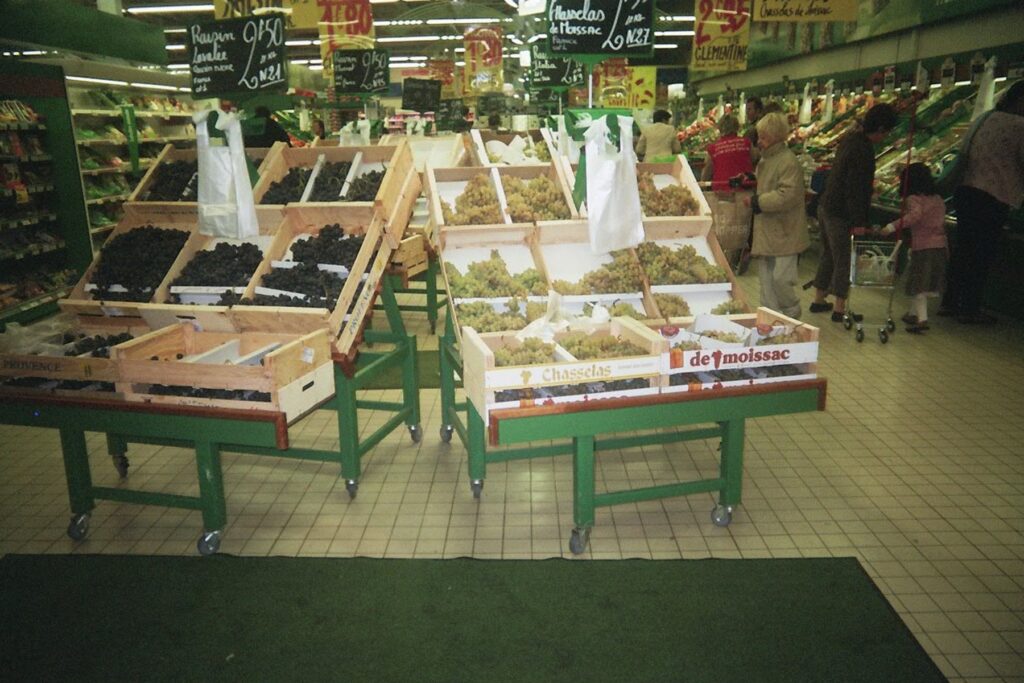 On October 7th, 2006, at the invitation of the Association des Amis du Frac Champagne-Ardenne, Nicolas Boulard organized a grape harvest with a view to producing the Grand Vin de Reims. This latter is the fruit of harvests made on all the “parcels” in the City of Rheims which, ironically, is not included in the Appellation d’Origine Contrôlée zone for champagne. The grapes were thus ‘picked’ in supermarkets and shopping malls, at various groceries, and even from decorative vines in greater Rheims, thus incorporating the city as a wine-produ- cing territory. These places are listed on the map accompanying this box of two half bottles.