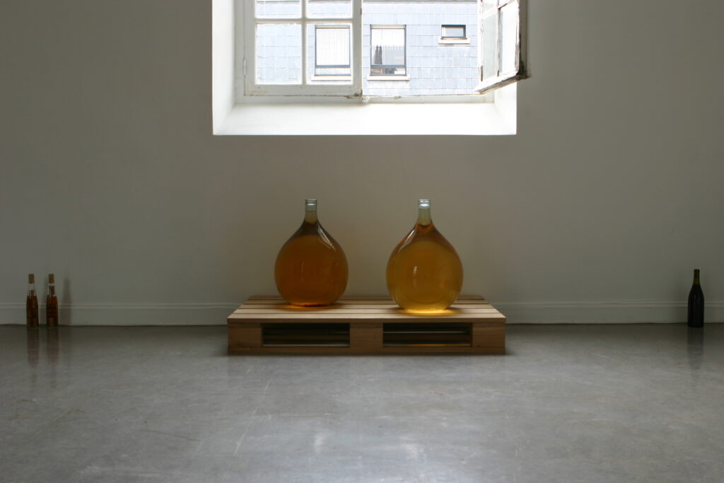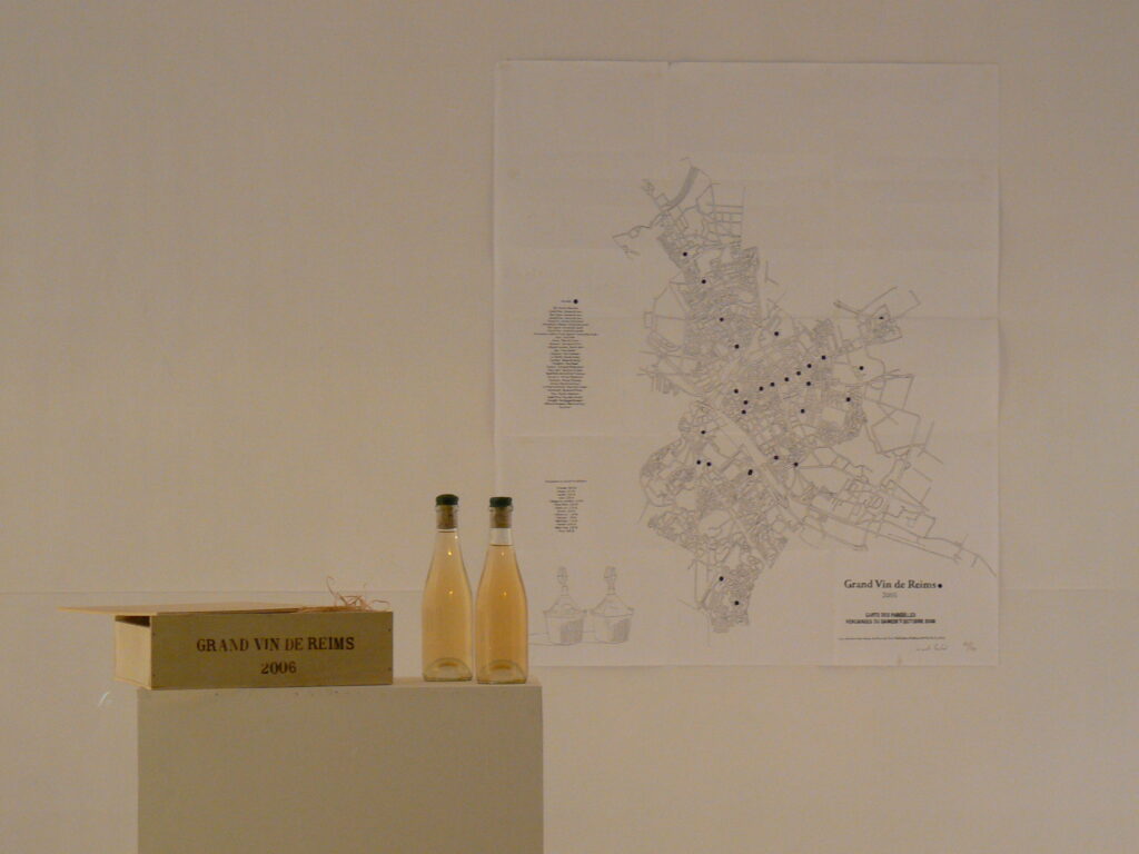 Le Grand Vin de Reims est le fruit de vendanges sur la totalité des « parcelles » de la ville de Reims : grandes surfaces, épiceries diverses, voire même les vignes décoratives des ronds-points. Sur 58 parcelles, à raison d’une récolte de 2 kg par parcelle, 116 kg de raisin ont été obtenus, ce qui a permis la production d’une centaine de demi-bouteilles d’un vin fabriqué à partir de raisin frais. La carte accompagnant le multiple permet de localiser chacune de ces parcelles alternatives et tout autant inédites. 2 bouteilles de vin dans un coffret en bois ; carte (impression numérique)